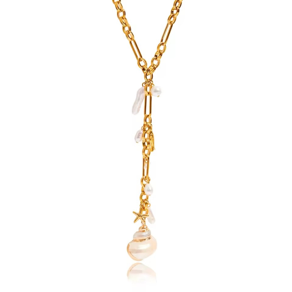 Lariat-style necklace featuring delicate shell charms, crafted from stainless steel and finished with 18K gold plating. A timeless and versatile piece that captures both freshness and elegance, perfect for elevating day-to-night looks with a subtle, ocean-inspired touch.