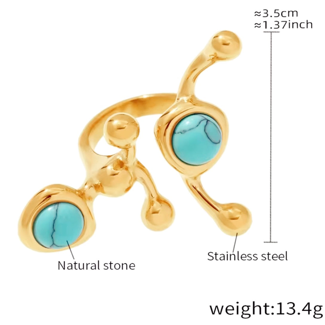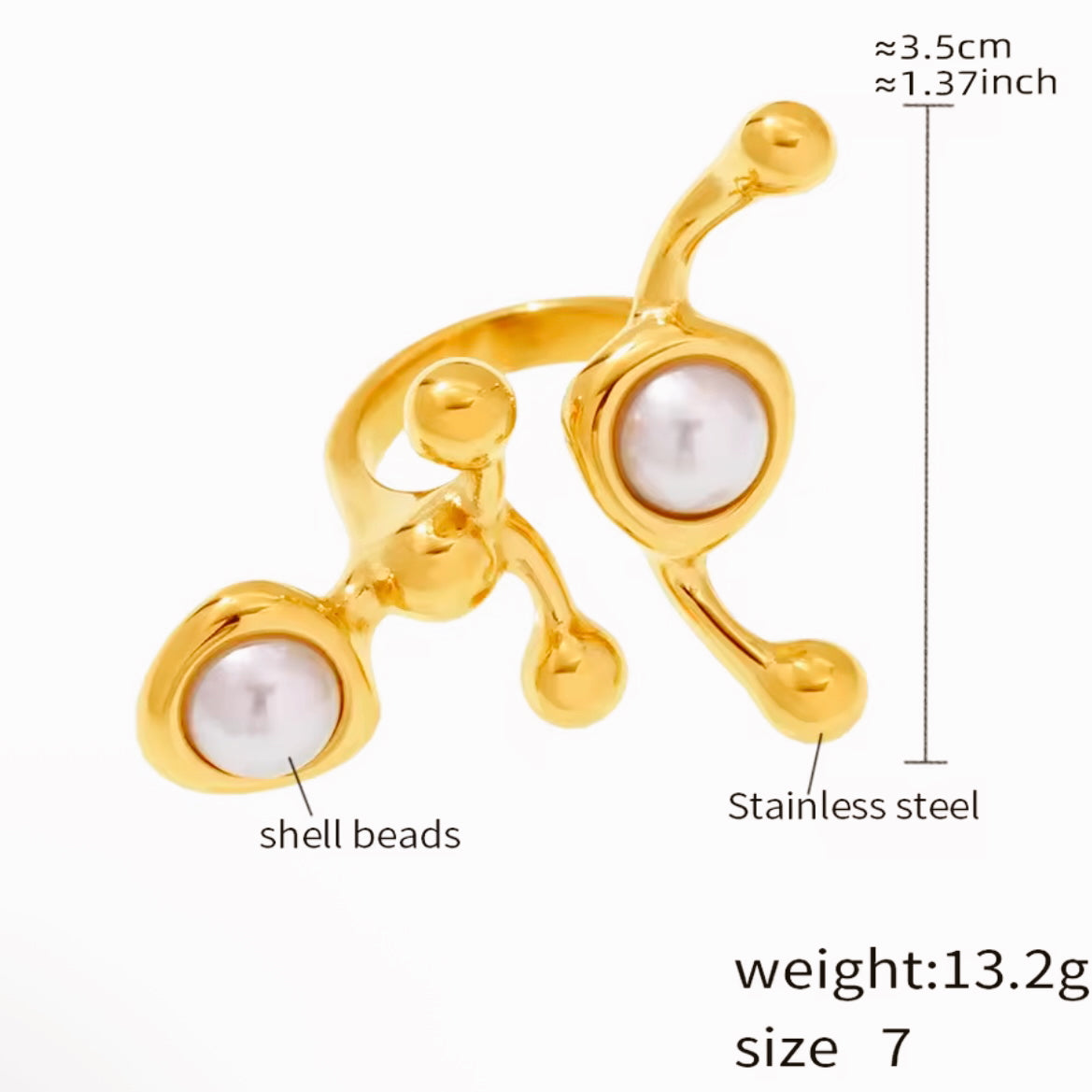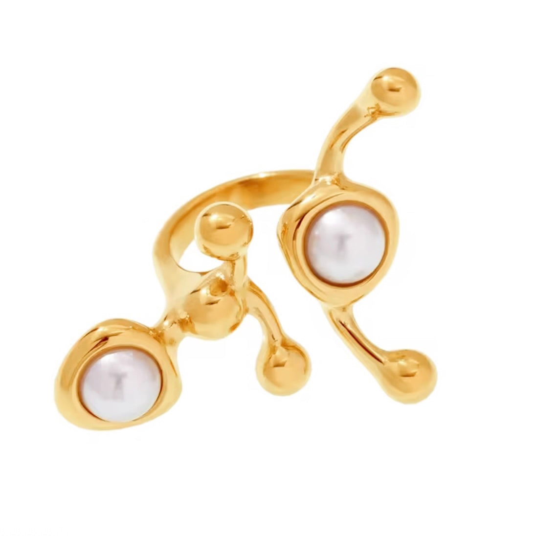 A ring that turns heads with its bold and elegant design. The pearls, an eternal symbol of femininity and sophistication, make it a statement accessory that transforms any look. Crafted in stainless steel with 18k gold plating, it is tarnish-resistant and waterproof, allowing you to enjoy its lasting shine and charm every day.
